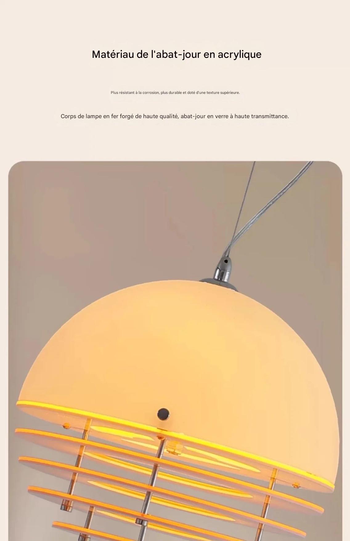 Cette suspension acrylique offre un design Bauhaus médiéval orange coucher de soleil. L'abat-jour acrylique cintrage à chaud diffuse une lumière chaude créant ambiance simple et atmosphérique. Finition fer. Ampoule LED incluse. Culot E27, 3 sources lumineuses. Coloris blanc ou jaune. Idéale pour restaurant, café, bar, îlot cuisine, fenêtre ou plafond recherchant suspension Bauhaus caractère et ambiance chaleureuse.