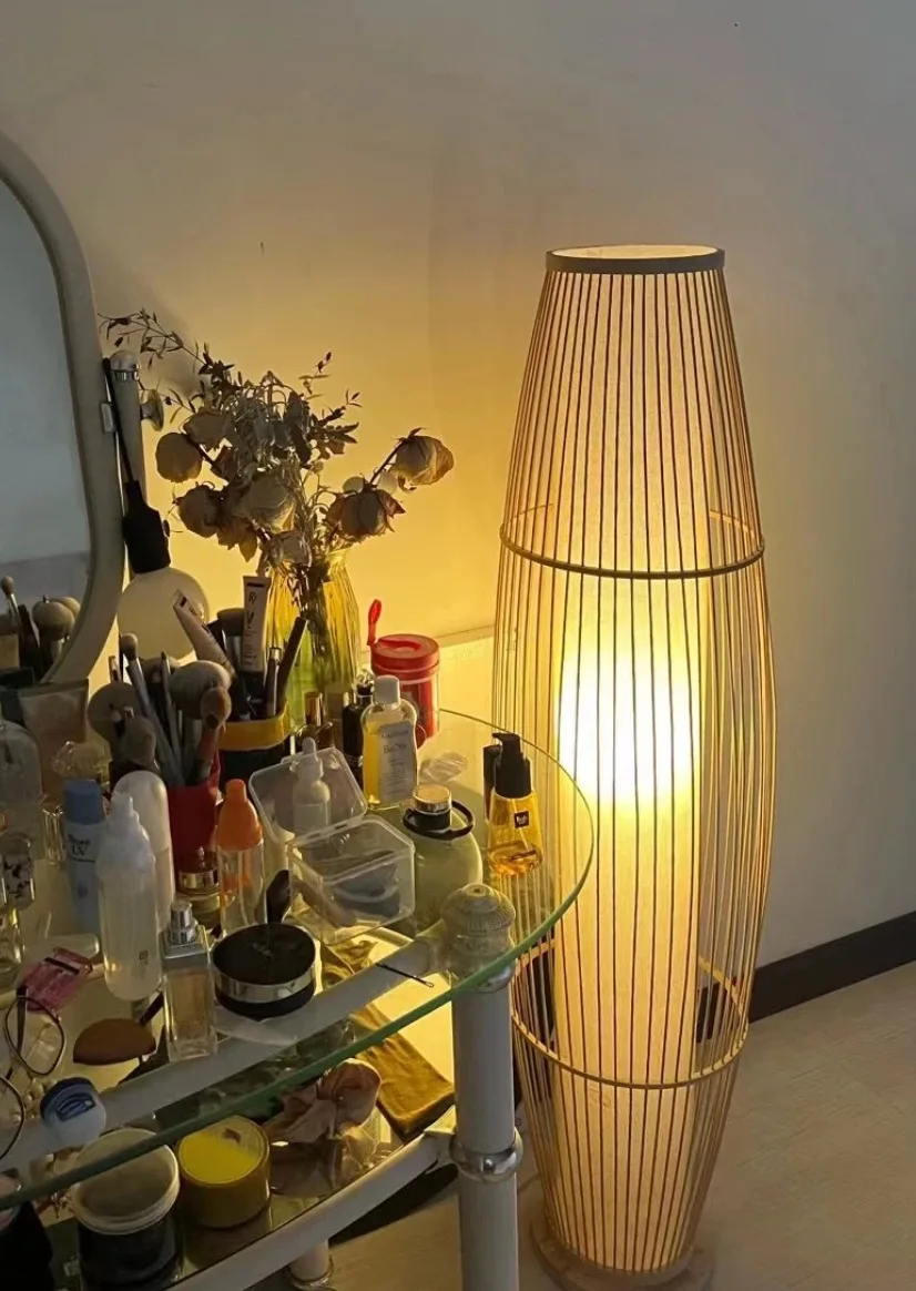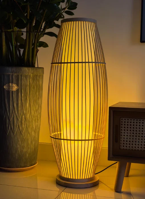 Lampadaire d'exception alliant bambou naturel tressé à la main et bois massif, inspiré de l'esthétique japonaise. Ses jeux d'ombres organiques créent une ambiance zen et contemplative. Double LED pour une lumière douce et tamisée couvrant 10-15m². Idéal pour salons de thé, spas, restaurants japonais et intérieurs zen, wabi-sabi, japandi.